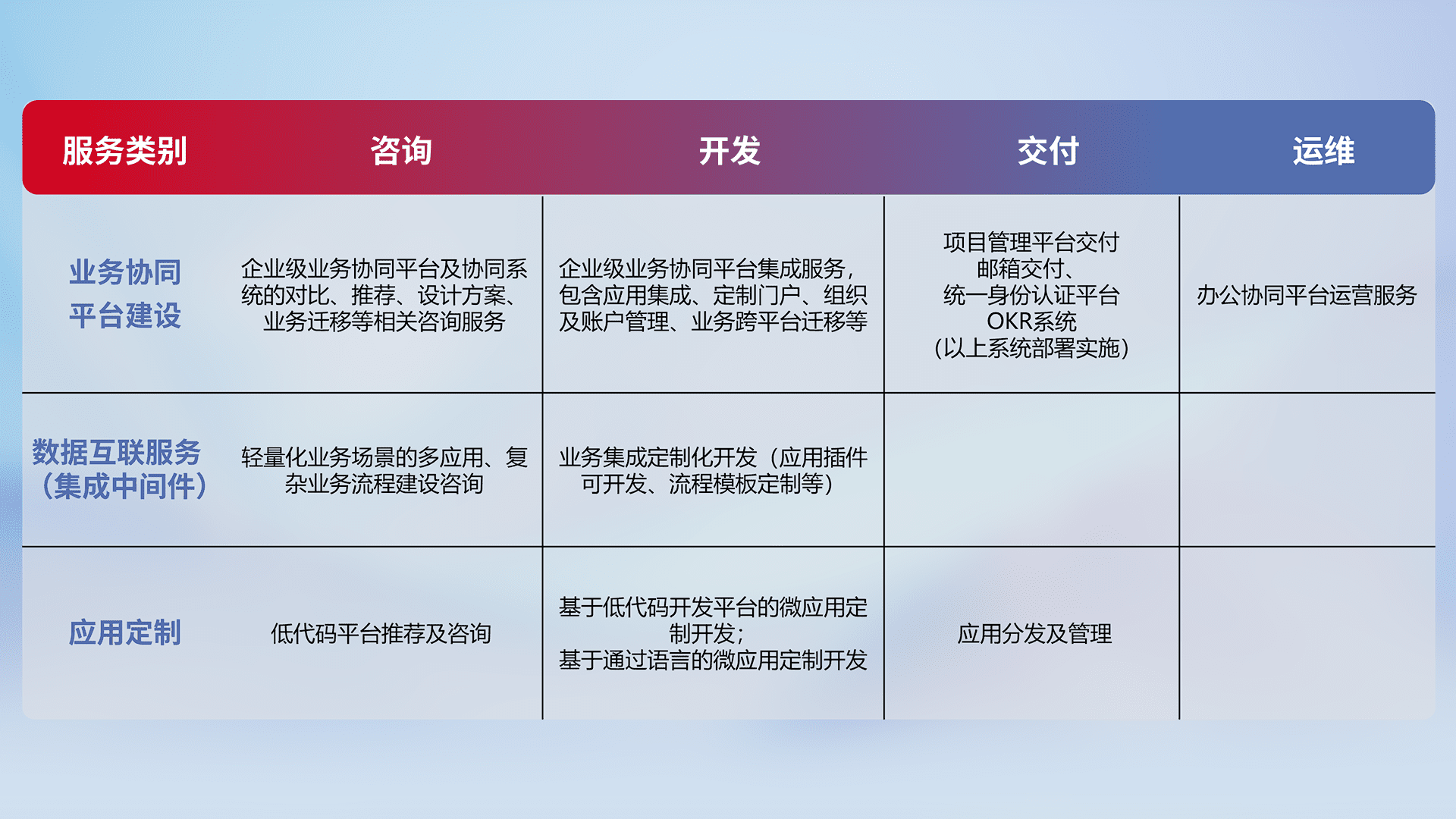 针对钉钉、、、、企微、、IDaas等平台级产品提供产品的规划、、、、方案、、、交付、、、、定制化开发等服务,,,实现如统一协同办公、、、智能客户服务、、、、混合会议管理、、、、智能数据查询、、、等业务场景,,,实现数字化转型。。。。