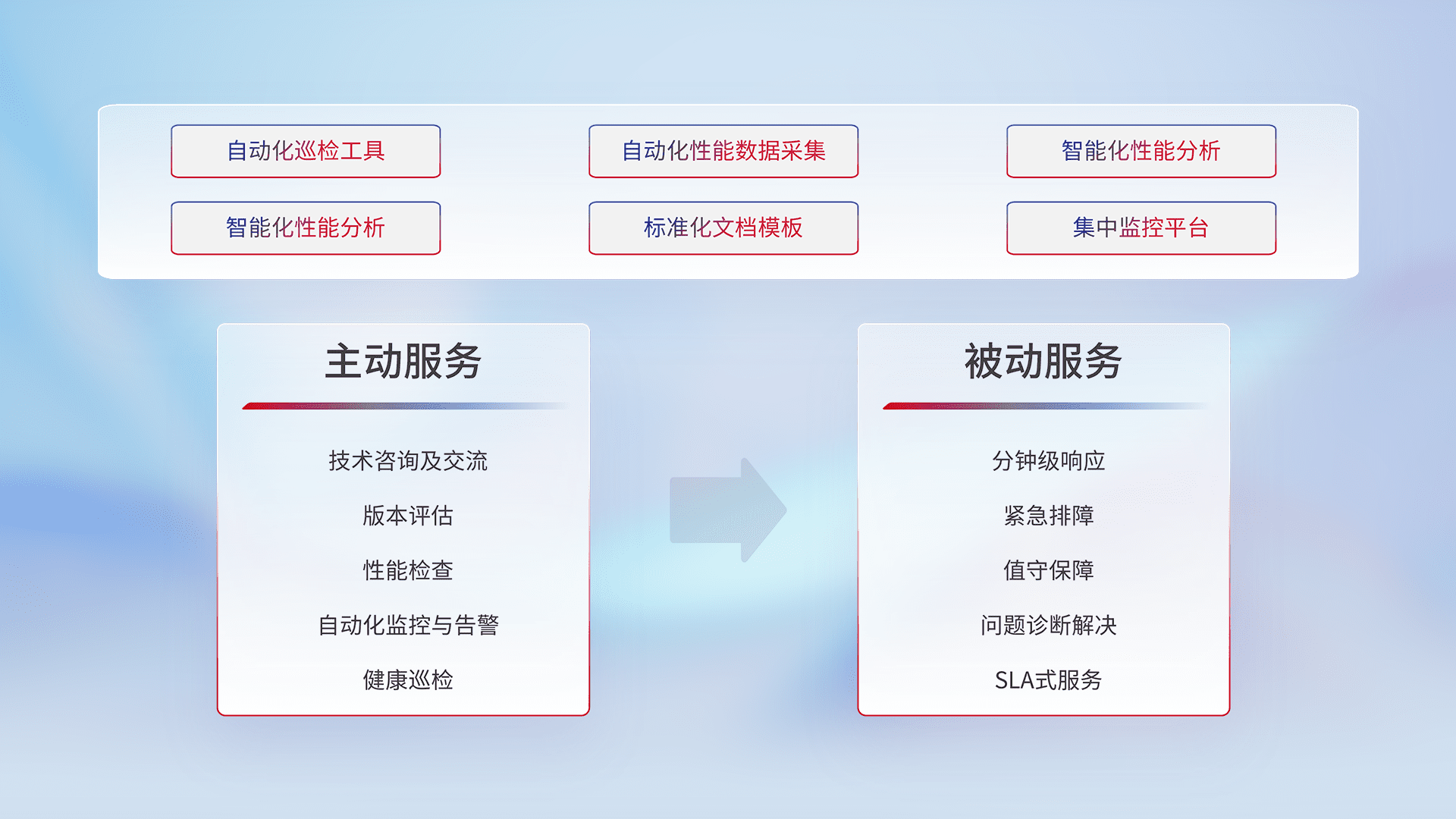 智能化工具和标准化文档,,,,保障服务质量,,,提供主动服务(包含技术咨询、、、、版本评估、、、性能检查、、自动化监控与告警、、、健康巡检)和被动服务包含(分钟级响应、、紧急排障、、、值守保障、、、问题诊断解决、、SLA服务)。。